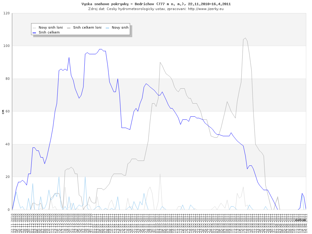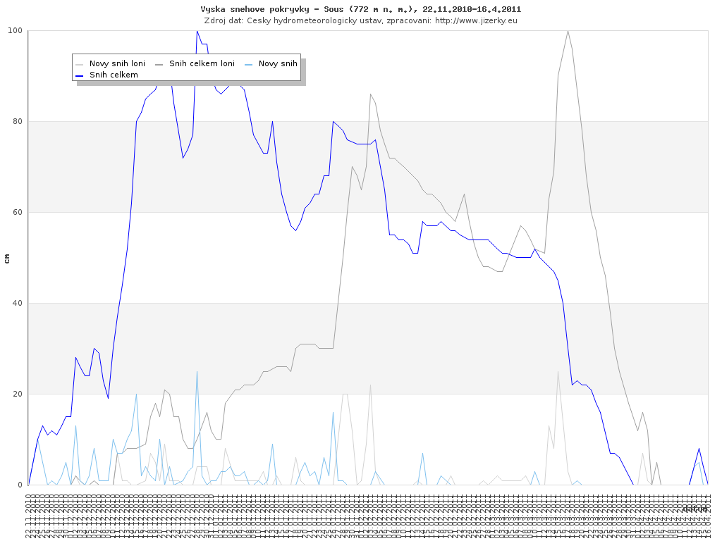 Na této stránce jsou zobrazeny grafy aktuálního vývoje sněhové pokrývky v Jizerských horách, který je sledován na meteorologických stanicích v Bedřichově a na Souši. Data jsou denně přebírána ze stránek Českého hydrometeorologického ústavu.