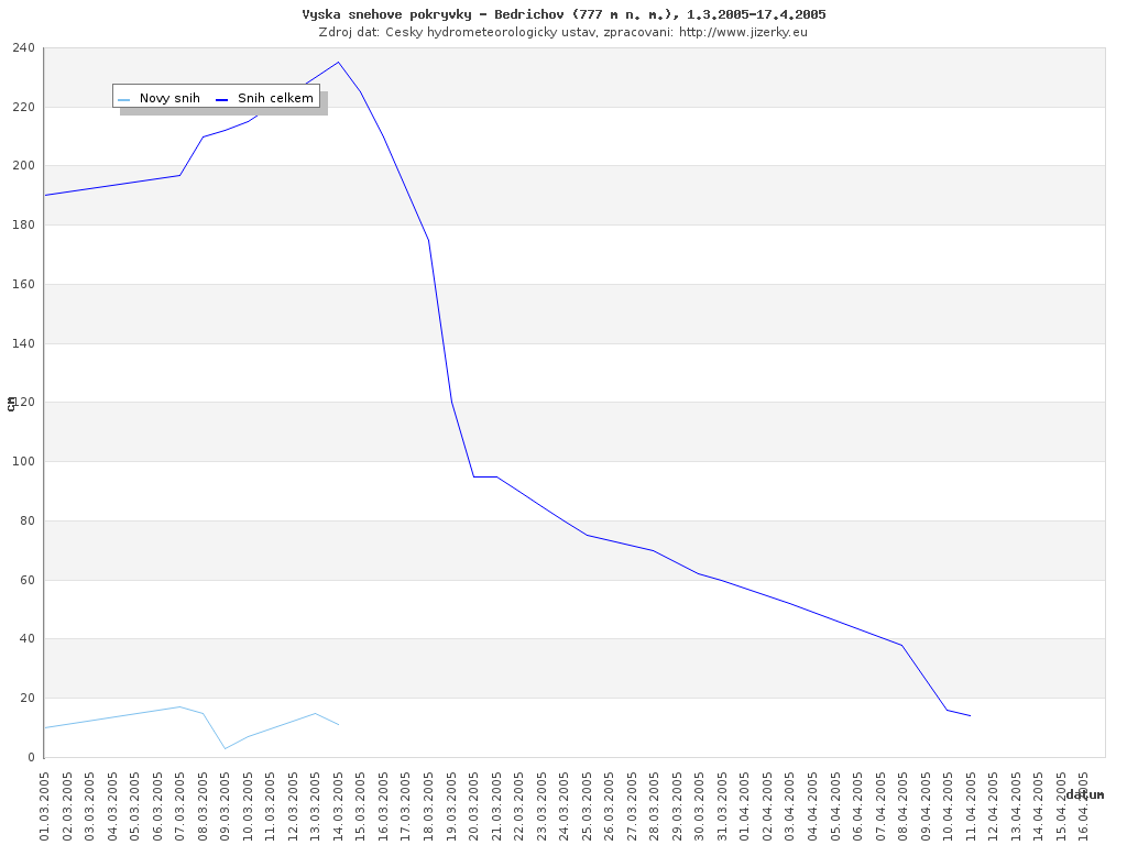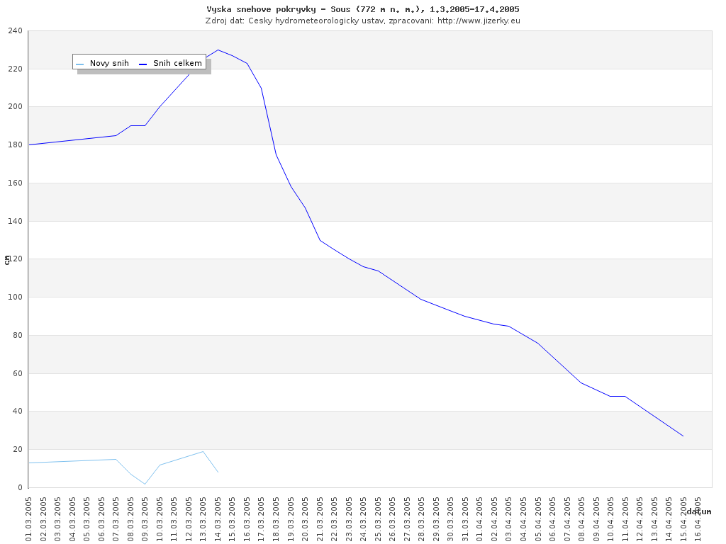 Na této stránce jsou zobrazeny grafy aktuálního vývoje sněhové pokrývky v Jizerských horách, který je sledován na meteorologických stanicích v Bedřichově a na Souši. Data jsou denně přebírána ze stránek Českého hydrometeorologického ústavu.