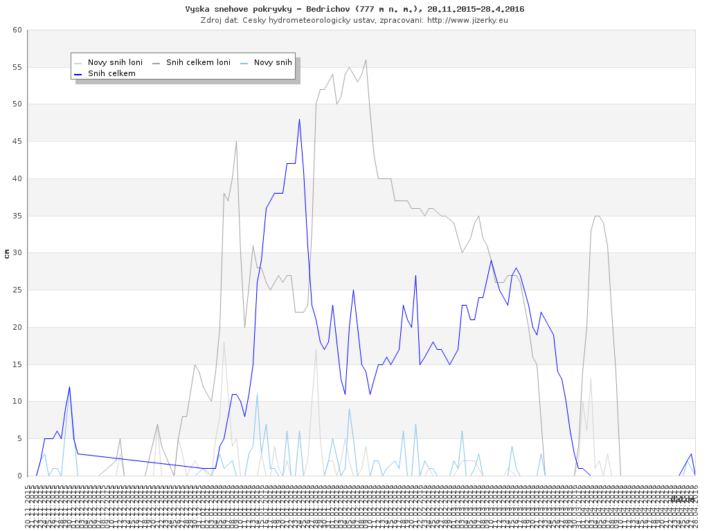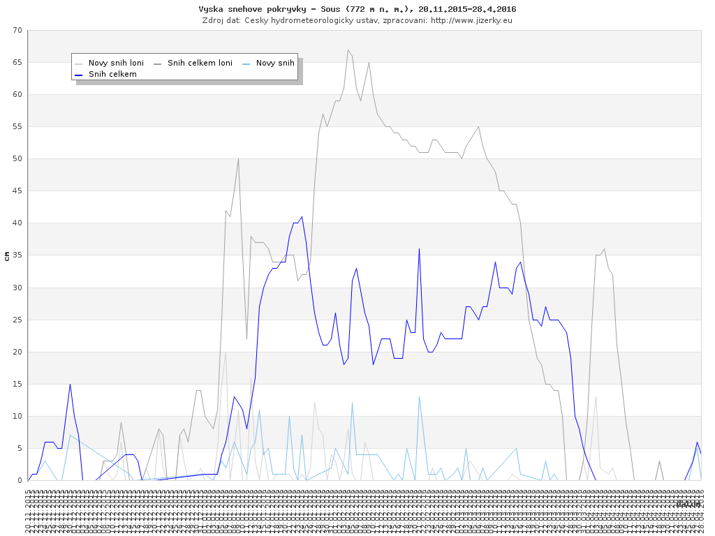 Na této stránce jsou zobrazeny grafy aktuálního vývoje sněhové pokrývky v Jizerských horách, který je sledován na meteorologických stanicích v Bedřichově a na Souši. Data jsou denně přebírána ze stránek Českého hydrometeorologického ústavu.