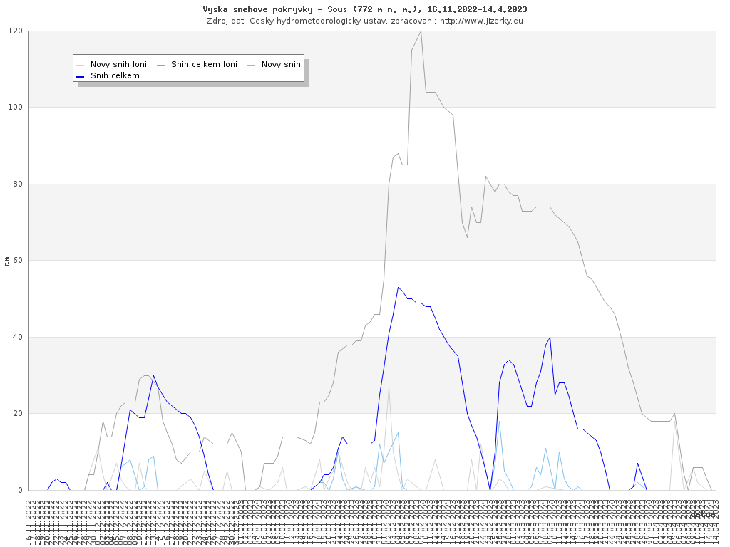 Na této stránce jsou zobrazeny grafy aktuálního vývoje sněhové pokrývky v Jizerských horách, který je sledován na meteorologických stanicích v Bedřichově a na Souši. Data jsou denně přebírána ze stránek Českého hydrometeorologického ústavu.