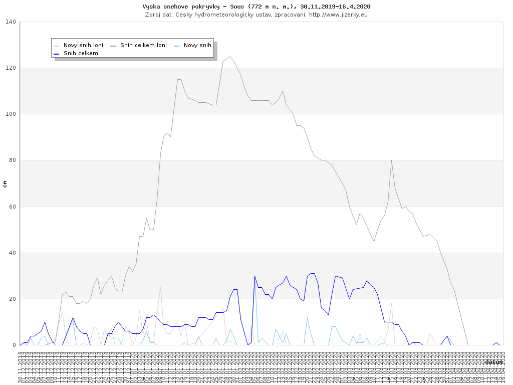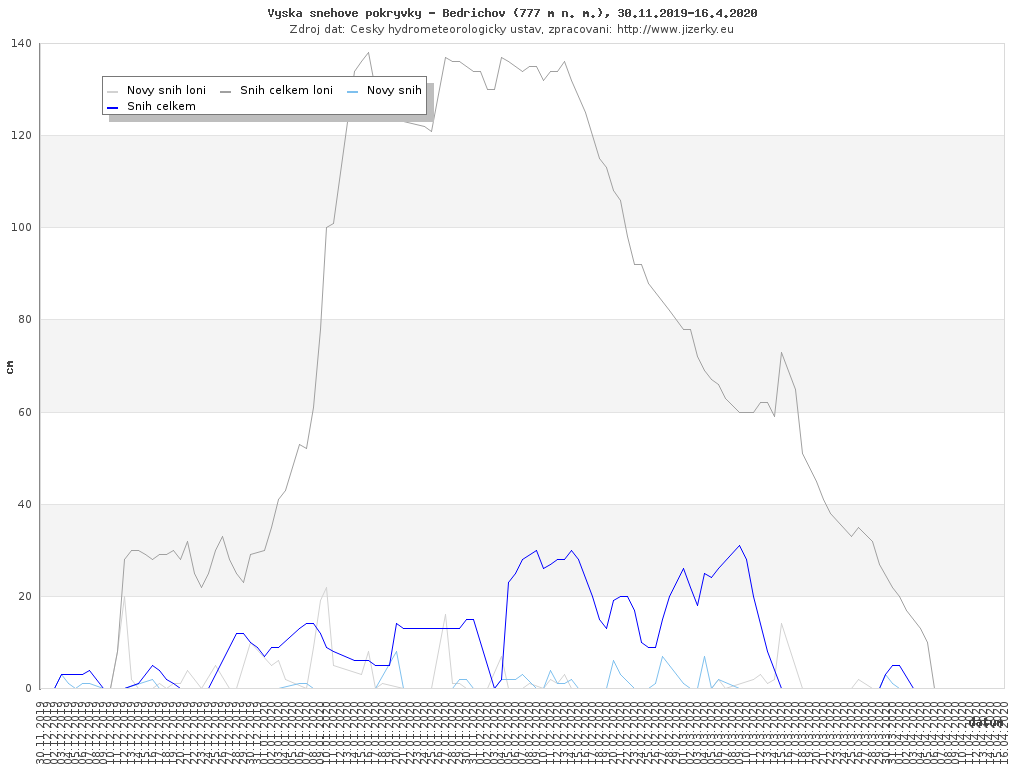 Na této stránce jsou zobrazeny grafy aktuálního vývoje sněhové pokrývky v Jizerských horách, který je sledován na meteorologických stanicích v Bedřichově a na Souši. Data jsou denně přebírána ze stránek Českého hydrometeorologického ústavu.