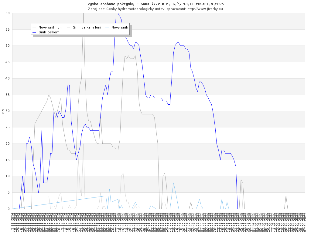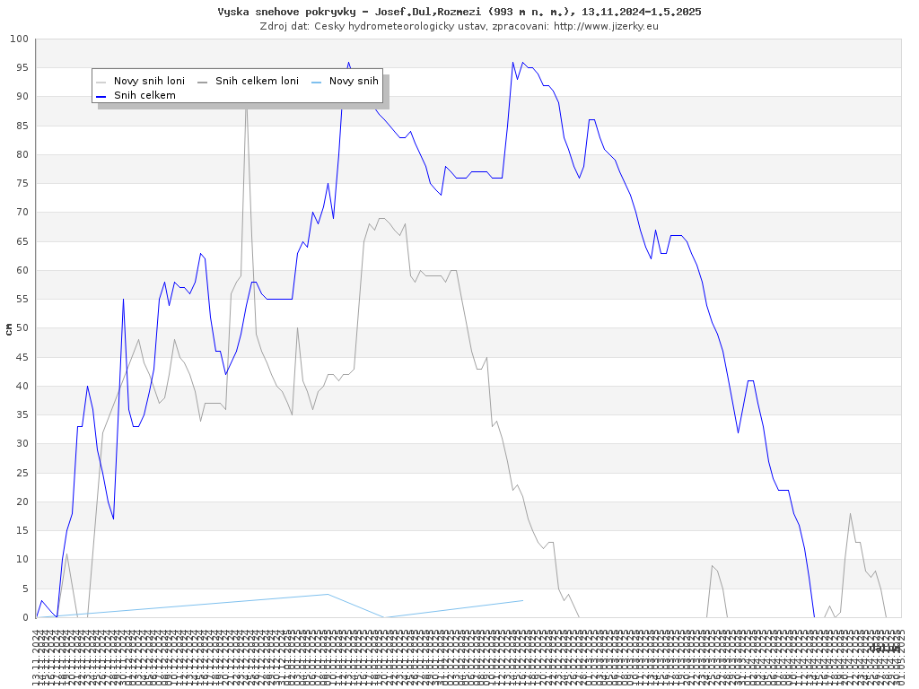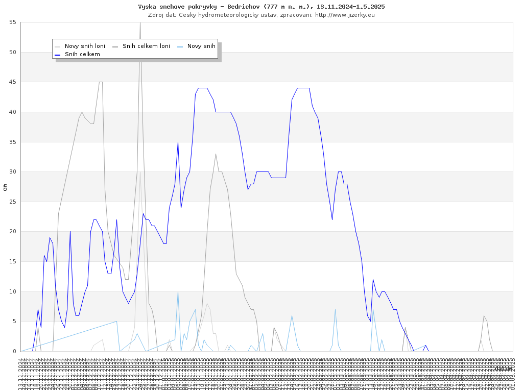 Na této stránce jsou zobrazeny grafy aktuálního vývoje sněhové pokrývky v Jizerských horách, který je sledován na meteorologických stanicích v Bedřichově a na Souši. Data jsou denně přebírána ze stránek Českého hydrometeorologického ústavu.