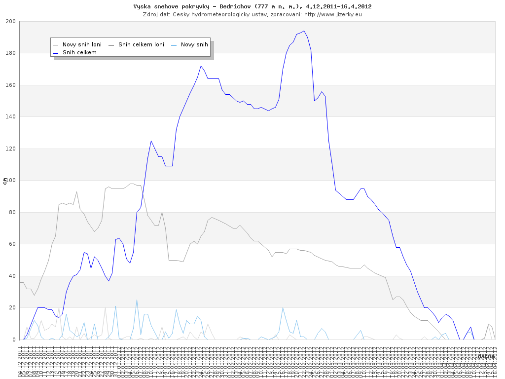Na této stránce jsou zobrazeny grafy aktuálního vývoje sněhové pokrývky v Jizerských horách, který je sledován na meteorologických stanicích v Bedřichově a na Souši. Data jsou denně přebírána ze stránek Českého hydrometeorologického ústavu.