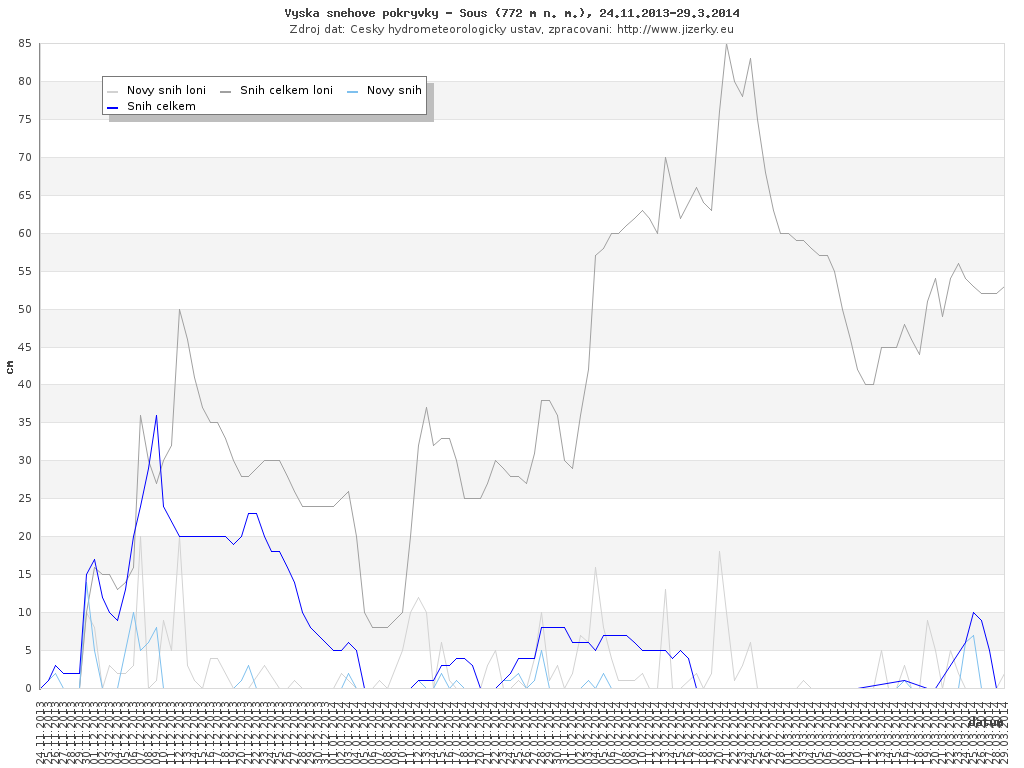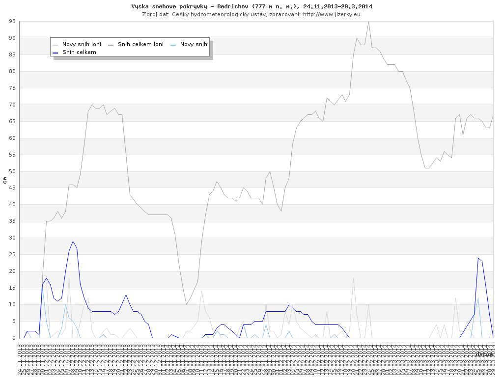 Na této stránce jsou zobrazeny grafy aktuálního vývoje sněhové pokrývky v Jizerských horách, který je sledován na meteorologických stanicích v Bedřichově a na Souši. Data jsou denně přebírána ze stránek Českého hydrometeorologického ústavu.