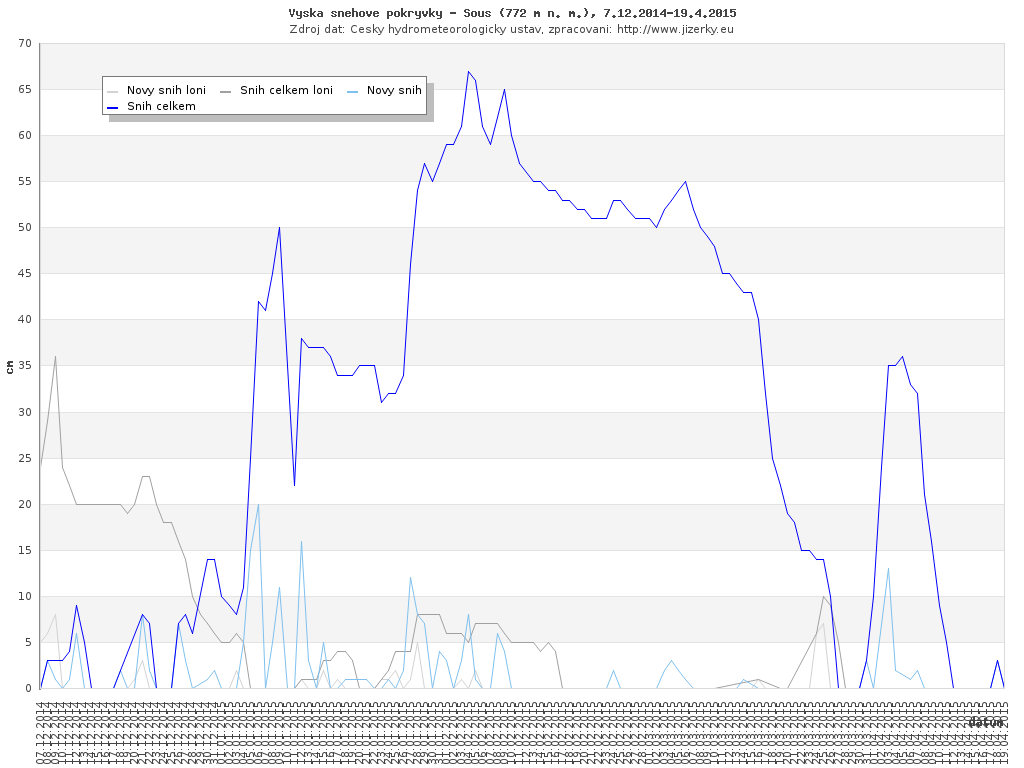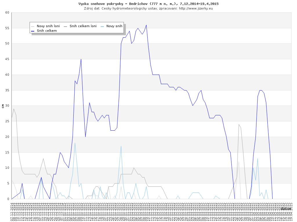 Na této stránce jsou zobrazeny grafy aktuálního vývoje sněhové pokrývky v Jizerských horách, který je sledován na meteorologických stanicích v Bedřichově a na Souši. Data jsou denně přebírána ze stránek Českého hydrometeorologického ústavu.