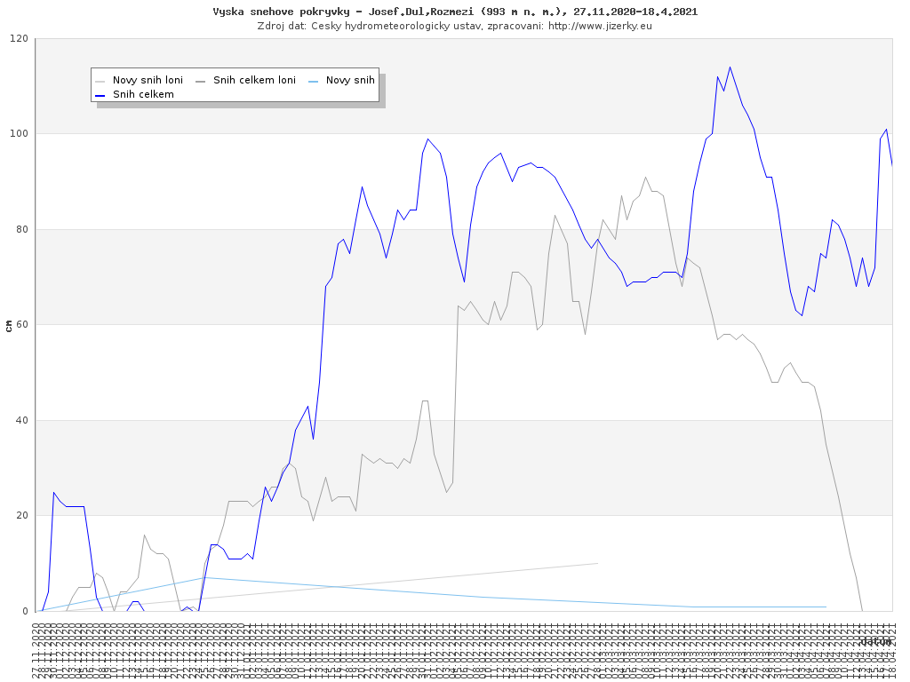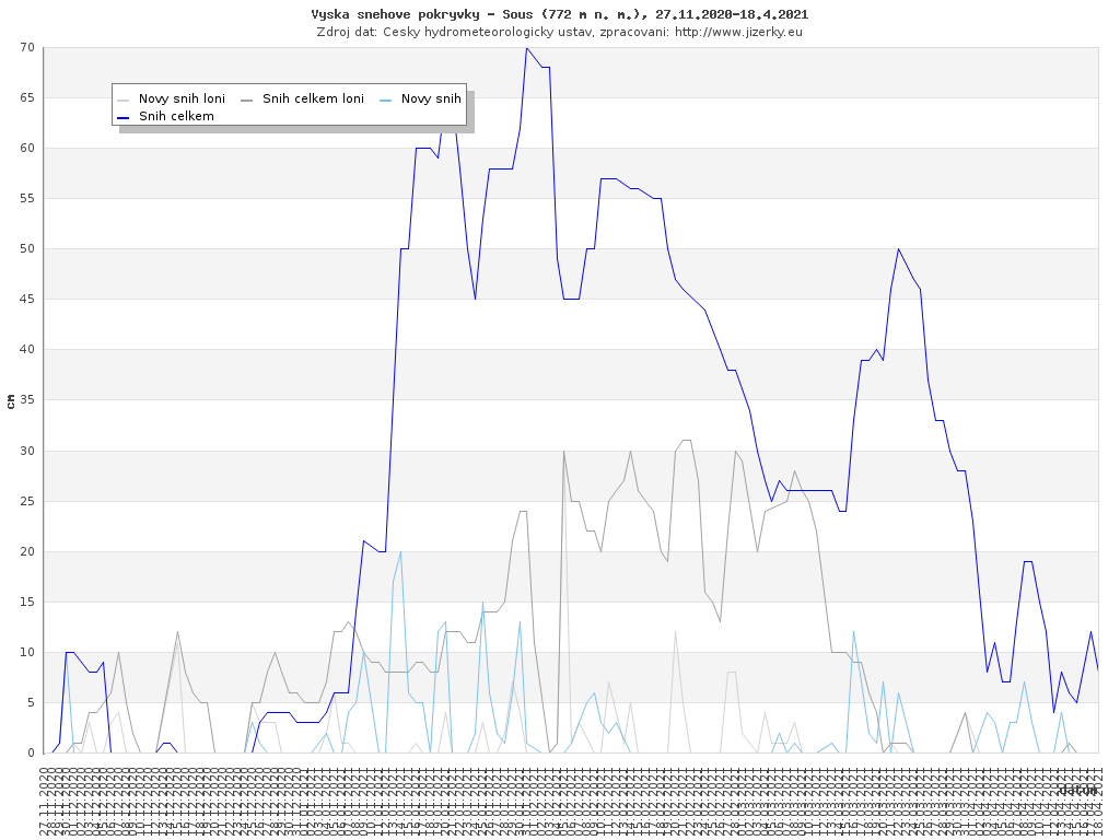 Na této stránce jsou zobrazeny grafy aktuálního vývoje sněhové pokrývky v Jizerských horách, který je sledován na meteorologických stanicích v Bedřichově a na Souši. Data jsou denně přebírána ze stránek Českého hydrometeorologického ústavu.