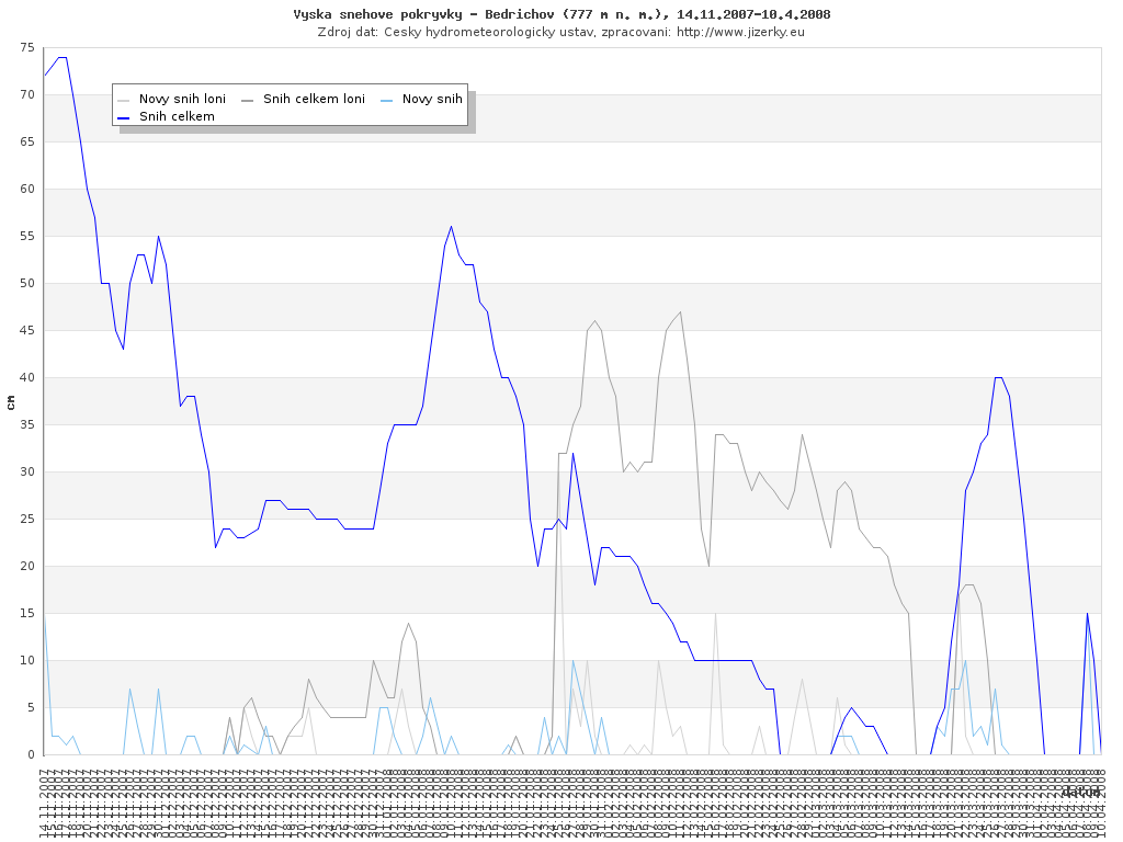 Na této stránce jsou zobrazeny grafy aktuálního vývoje sněhové pokrývky v Jizerských horách, který je sledován na meteorologických stanicích v Bedřichově a na Souši. Data jsou denně přebírána ze stránek Českého hydrometeorologického ústavu.