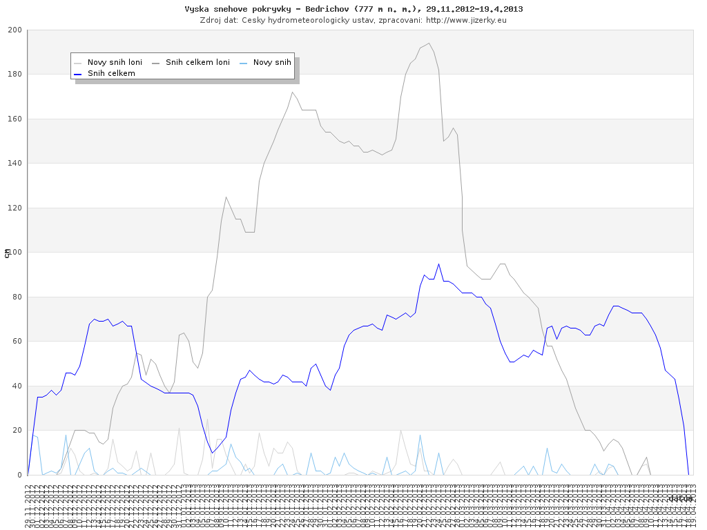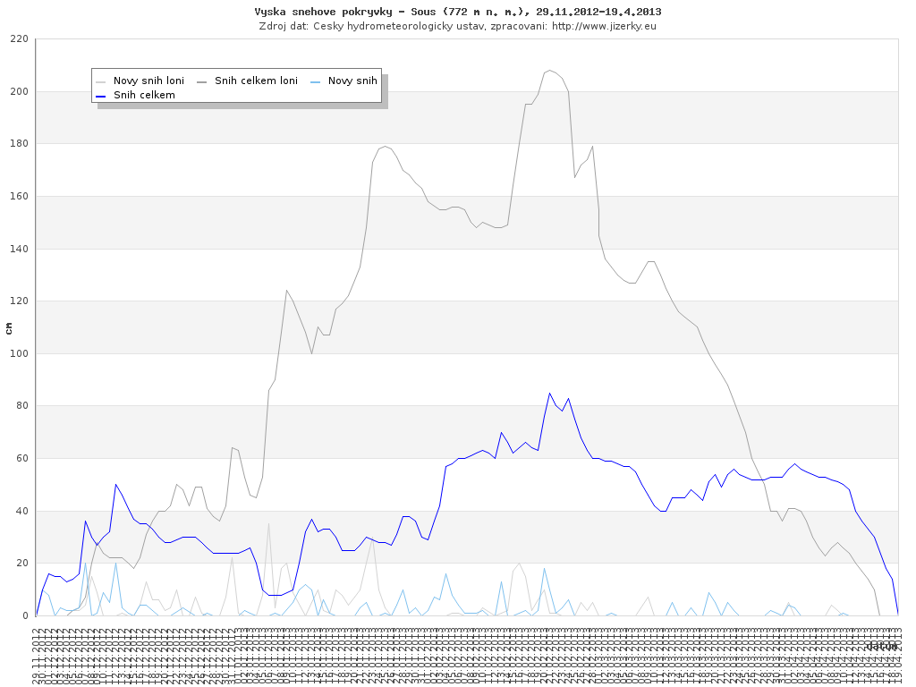 Na této stránce jsou zobrazeny grafy aktuálního vývoje sněhové pokrývky v Jizerských horách, který je sledován na meteorologických stanicích v Bedřichově a na Souši. Data jsou denně přebírána ze stránek Českého hydrometeorologického ústavu.